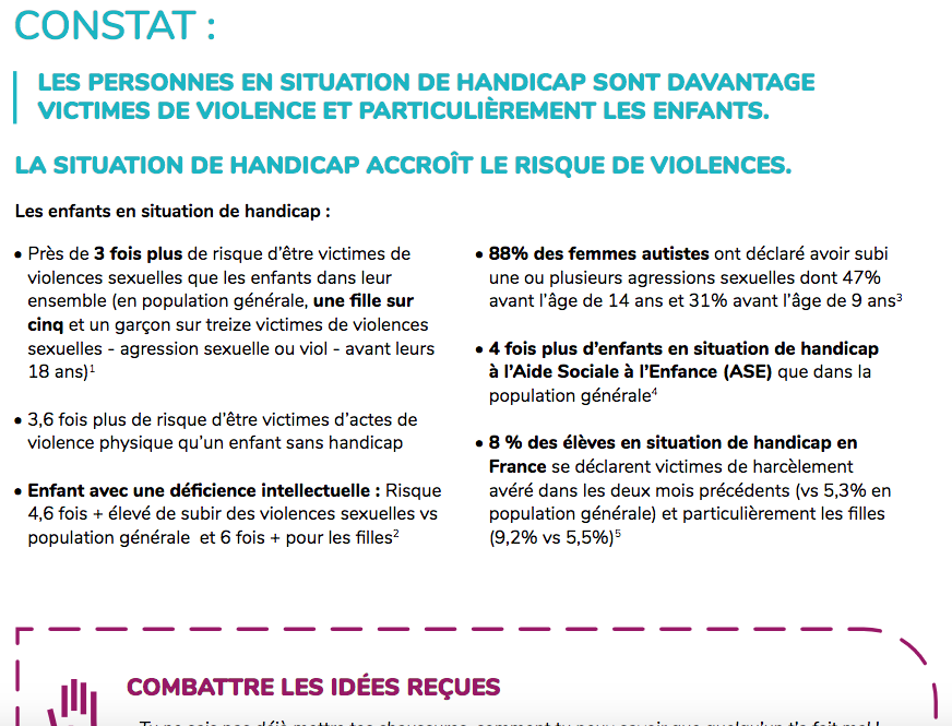 - Fiche « Les violences faites aux mineurs en situation de handicap » disponible ici