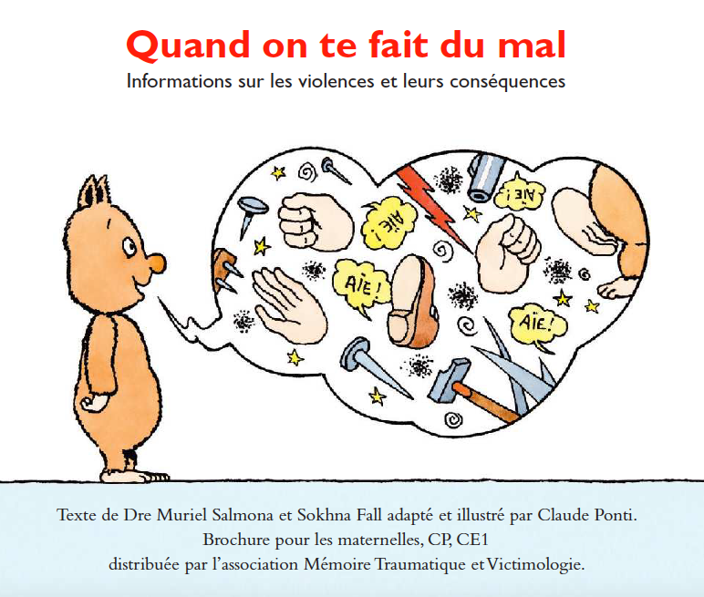 Une brochure d’informations sur les violences et leurs conséquences destinée aux enfants rédigé par Muriel Salmona, psychiatre spécialisée dans le psychotraumatisme et Sokhna Fall, dessinée et adaptée par Claude Ponti (pour les maternelles, CP, CE1).