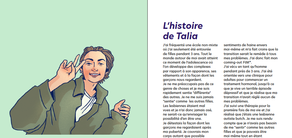 “Notre approche est centrée sur des témoignages provenant de personnes qui ont détransitionné. Notre intention n’est en aucun cas d’invalider certaines expériences ou identités, mais plutôt de montrer la complexité et la diversité de parcours qui sont souvent occultés.” Elie et Nele (autrices)